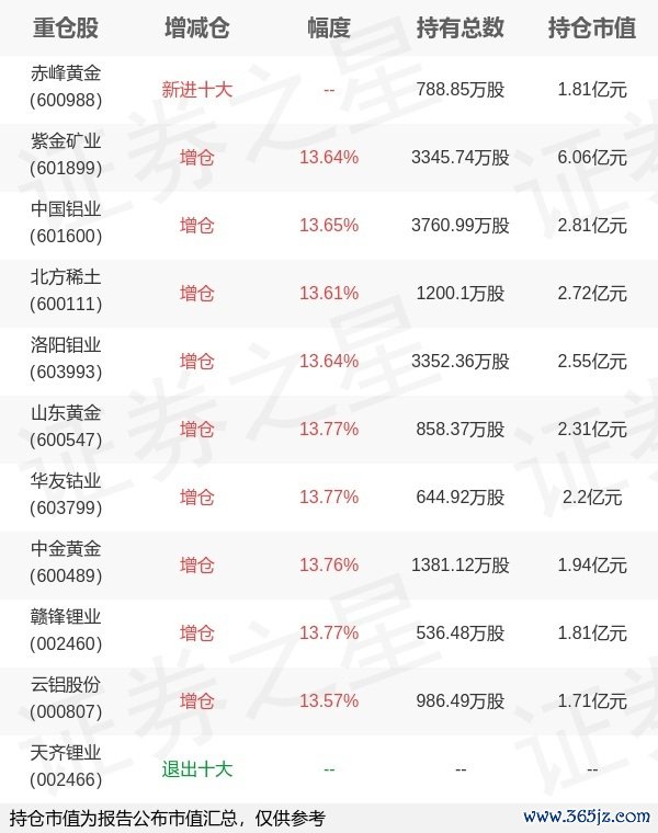 本站消息,4月22日南方基金旗下崔蕾管理的南方中证申万有色金属交易型开放式指数基金公布一季报丰云股票,近1年净值增长率-3.1%。与上一季度相比,该基金前十大重仓股新增赤峰黄金;并对紫金矿业增仓401.58万股,为该基金第一大重仓股;天齐锂业等退出前十大重仓股;详细数据如下: