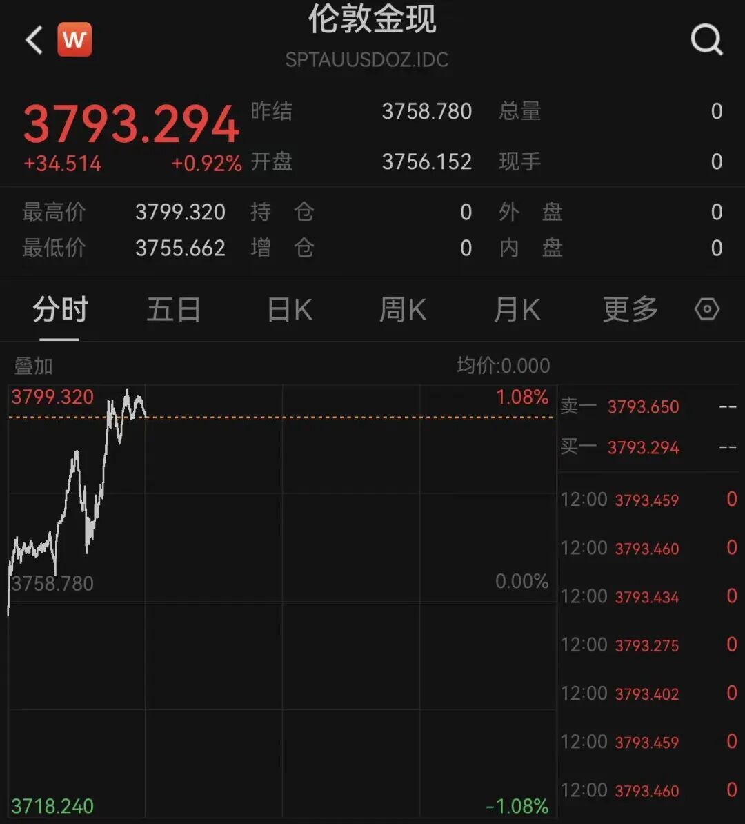 9月29日,现货黄金价格盘中再创新高,最高达到每盎司3799.32美元,离3800美元仅仅一步之遥,突破了此前9月23日创出的每盎司3791.08美元的高点。