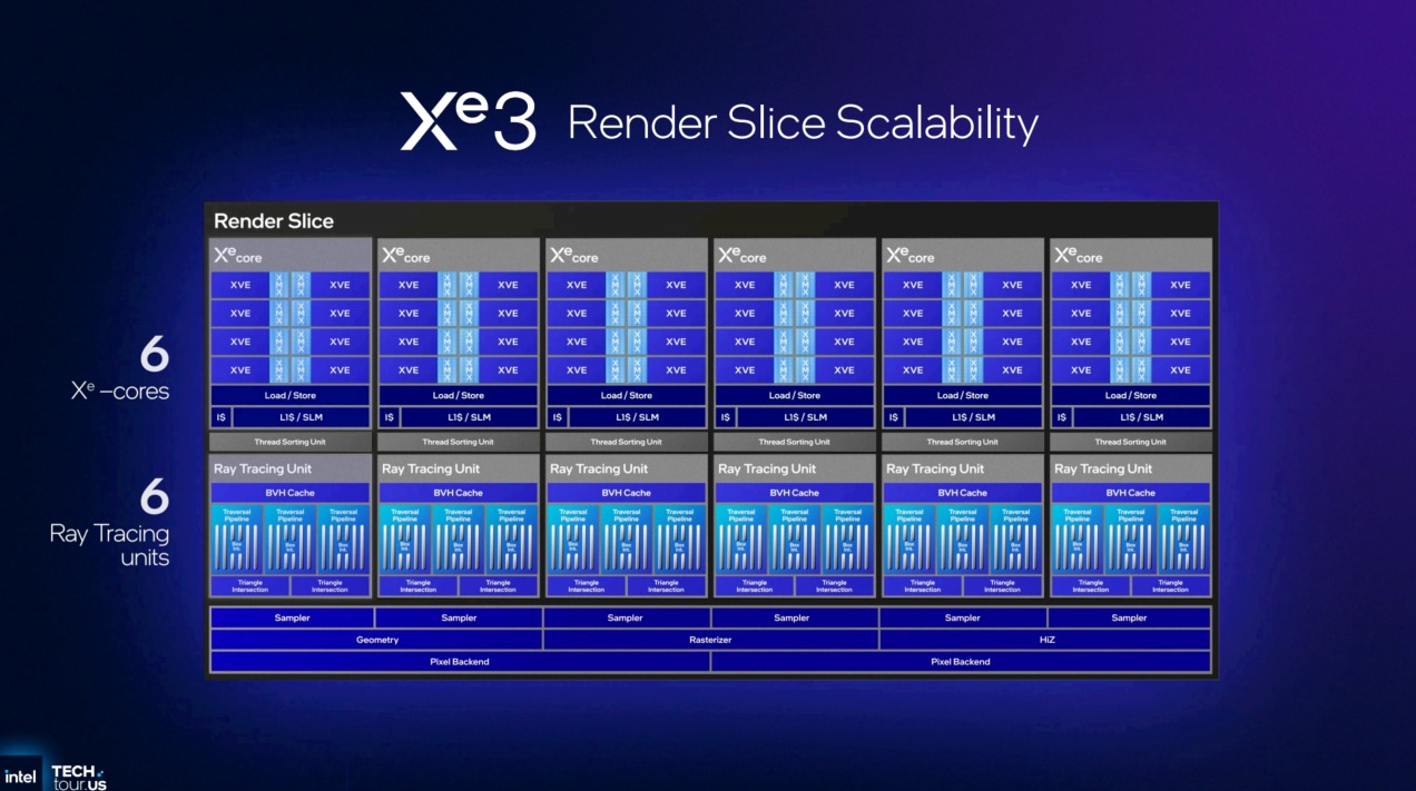 首先,能以4个Xe核心即可实现下一代的入门级性能,意味着Xe3核心对比上一代核心,实现了包括缓存容量的整体提升。确实,在依然沿用了渲染切片(Render Slice)设计的情况下,Xe3的Xe核心和光追单元数量都有增加。就算我们现在不知道两款iGPU的频率,也能从简单的数字变化,感觉到性能的提升。