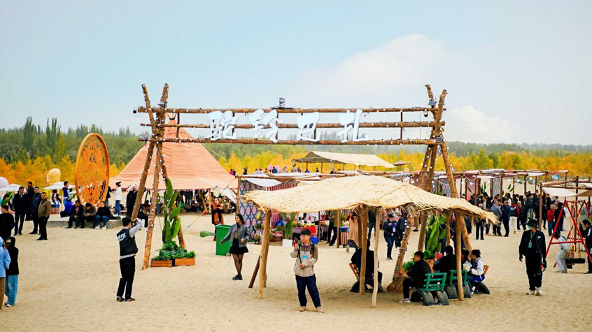 与此同时,精心打造的摊位市集与天幕休息区,让游客在心跳与沙漠共振之余,也能静享新疆风情。天幕帐篷为游客提供开放式的休憩交流空间,彩旗随风轻扬,似在热情迎客;圆木与艾德莱斯绸的纹样与蒲团的草木香气交织,让人心旷神怡。
